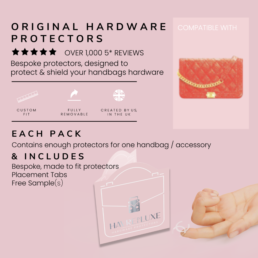 Keep your beloved designer bags and accessories flawless with the original Handbag Hardware Protectors. Protect your investment from scratches and scuffs with our premium, custom-fit hardware protectors.