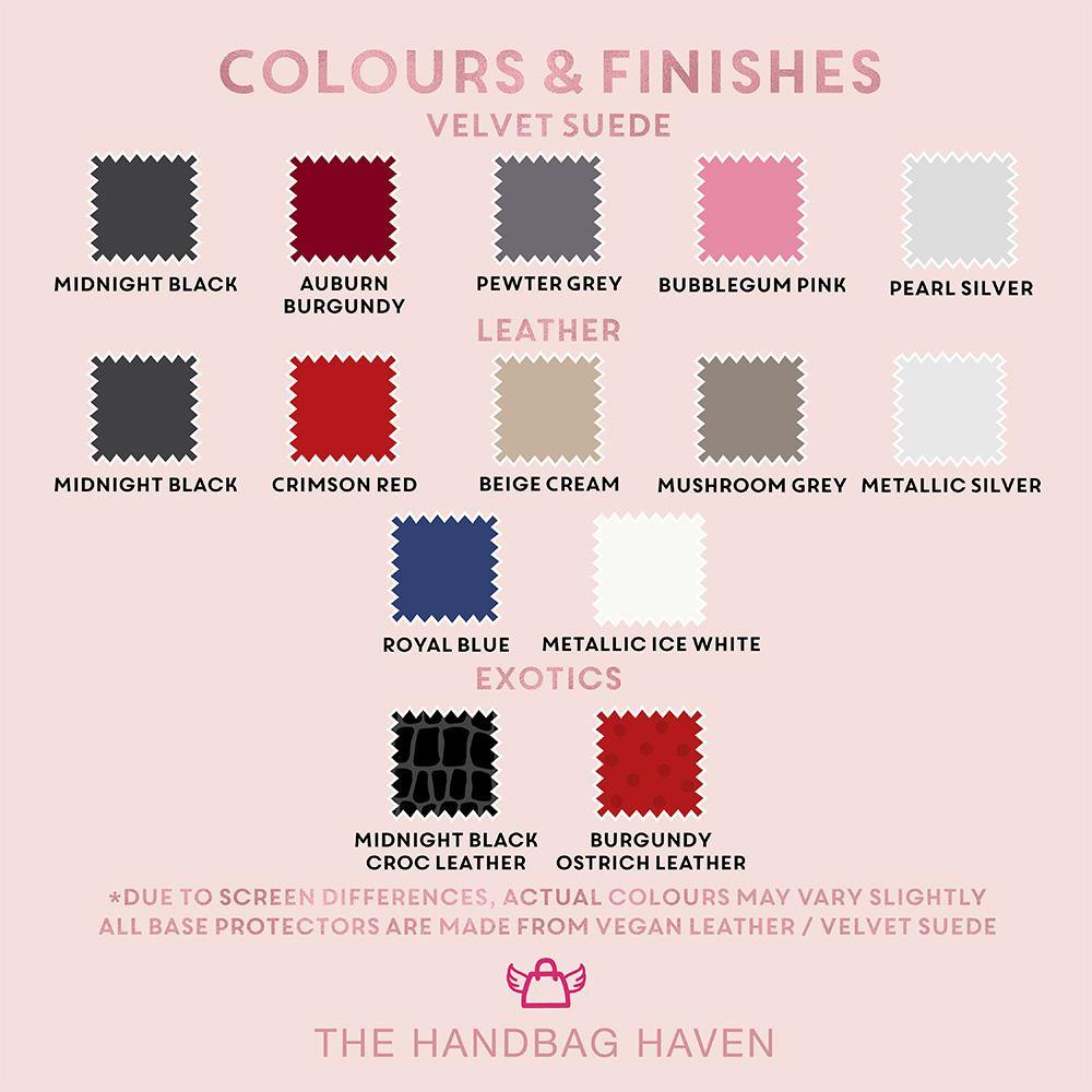 • Luxurious Material Options: Choose from our vegan leather for a sleek, modern touch or luxury velvet suede for a soft, elegant finish. Whether you want to match your bag’s interior or switch things up, we have a style to suit every handbag.